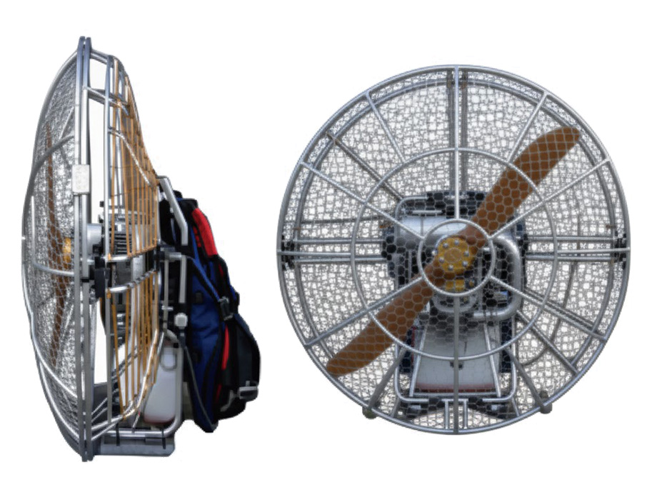 本体を背負うことが出来ます。土台フレームを使用した場合、上下の角度調整が可能です(左右は360° 調整可能)。燃料は混合ガソリン100:1を使用。